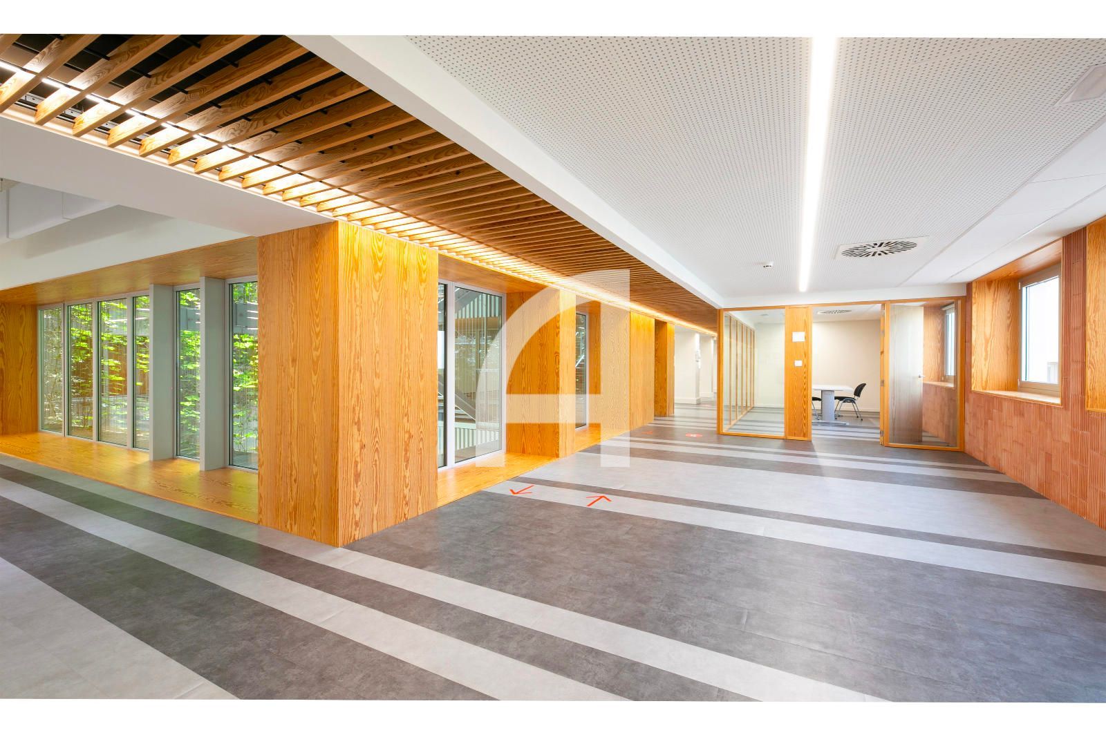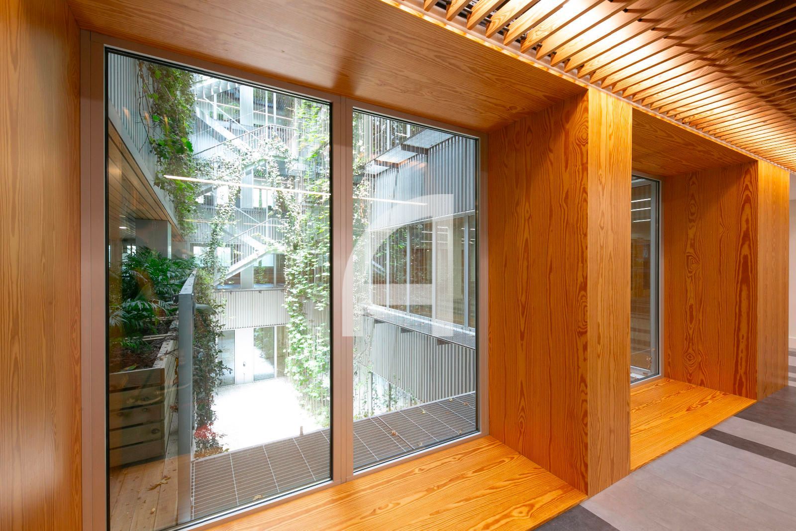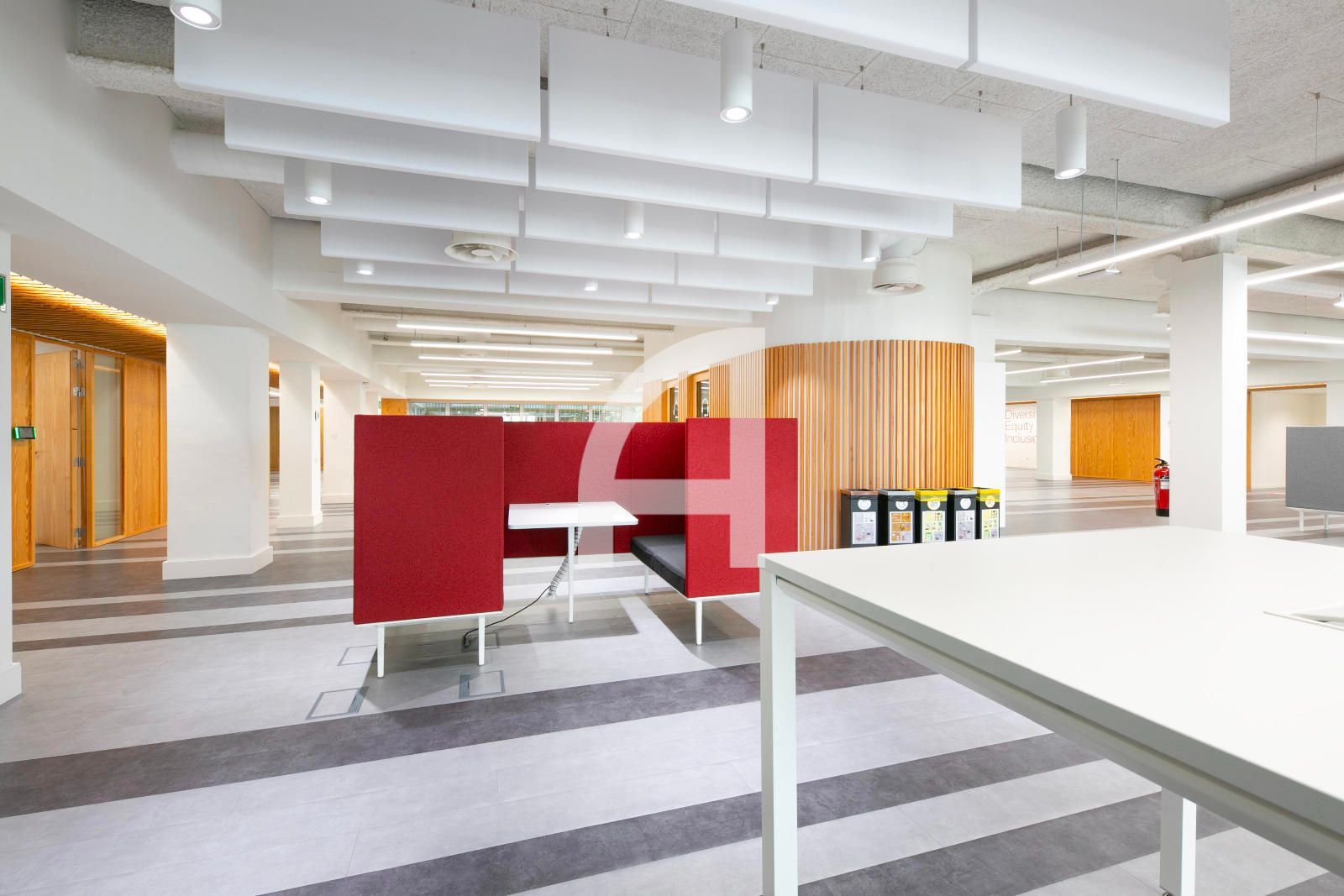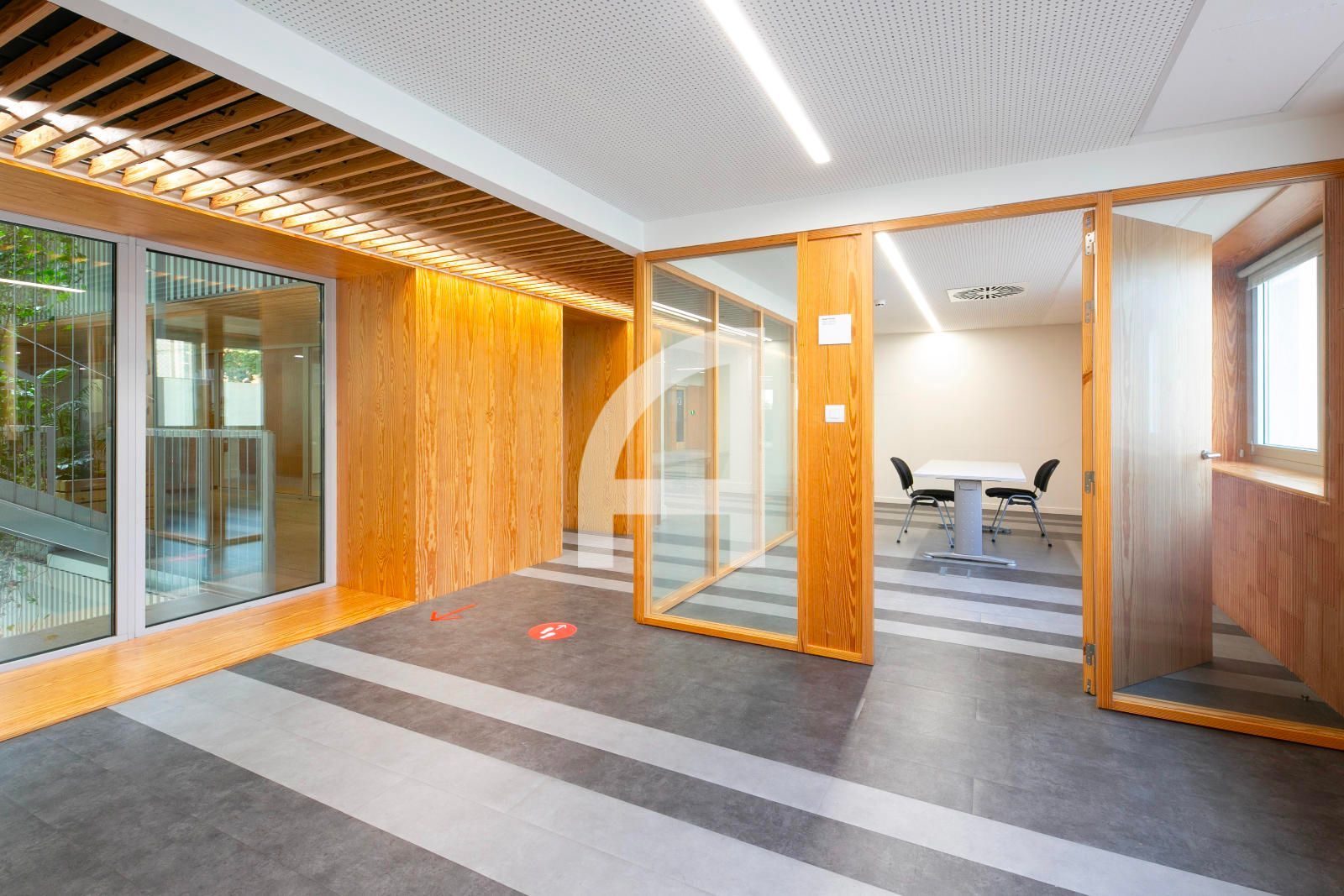 La superfície en qüestió, de 1.520m² construïts, ocupa tota la 1era planta real, i gira entorn a un pati central regat d'abundant vegetació i llum natural, i que s'estructura en una àmplia zona diàfana destinada a espais de treball, i dues franges laterals, que alberguen els nuclis de comunicació vertical i serveis, sales de reunions, despatxos, i àrees de descans. Gaudeix així mateix d'un lluminós pati posterior.
