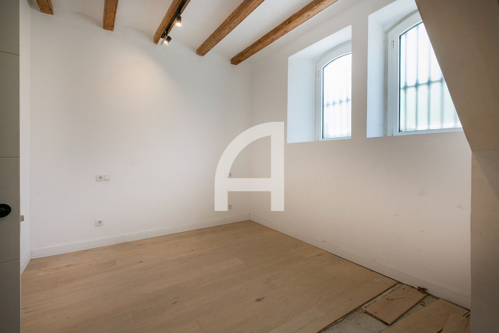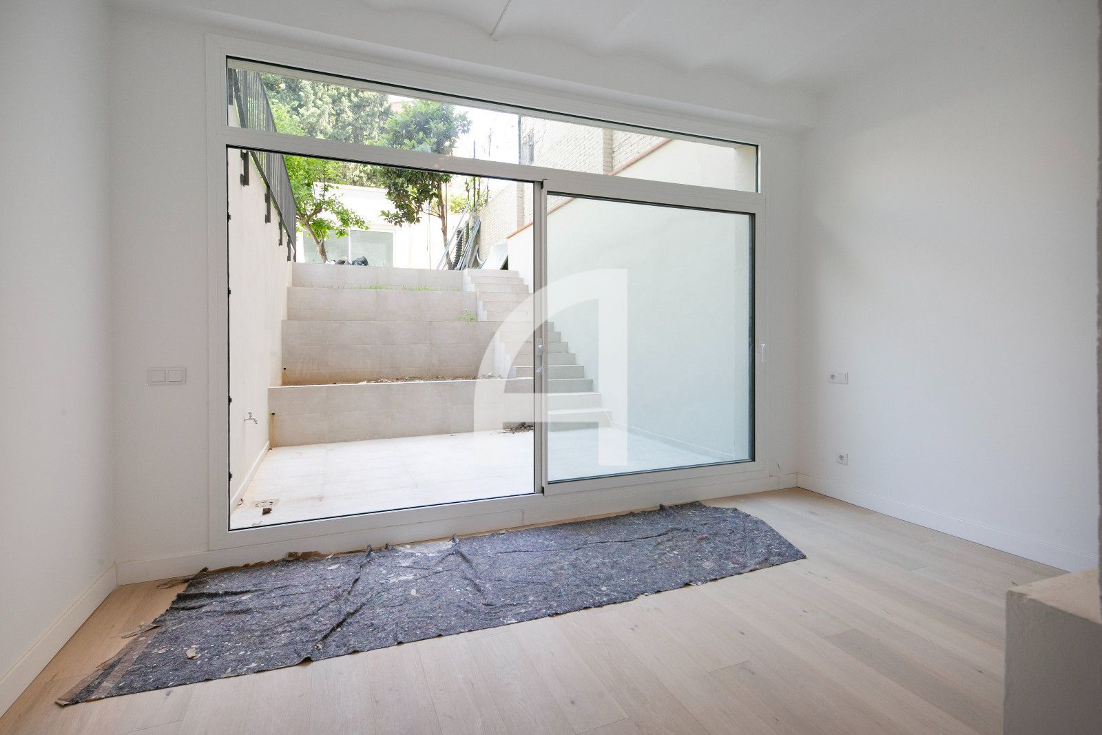 A l'interior destaquen sostres de més de tres metres i grans finestrals que inunden els espais de claredat i calidesa. La planta principal, dedicada a la zona de dia, presenta un espai diàfan que integra saló, menjador i cuina oberta, amb accés directe al jardí per a una connexió fluida entre interior i exterior. En aquesta planta se situa a més un bany complet i una habitació en suite, versàtil com a dormitori principal o zona multifuncional. El disseny d'aquest nivell afavoreix la versatilitat i la socialització, mantenint una distribució pràctica i coherent.