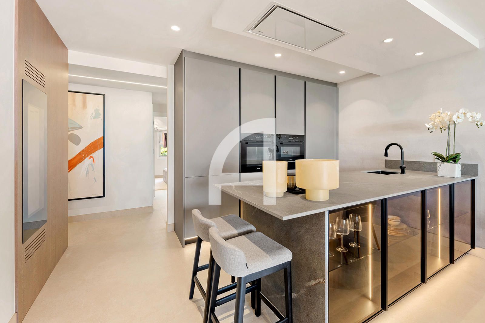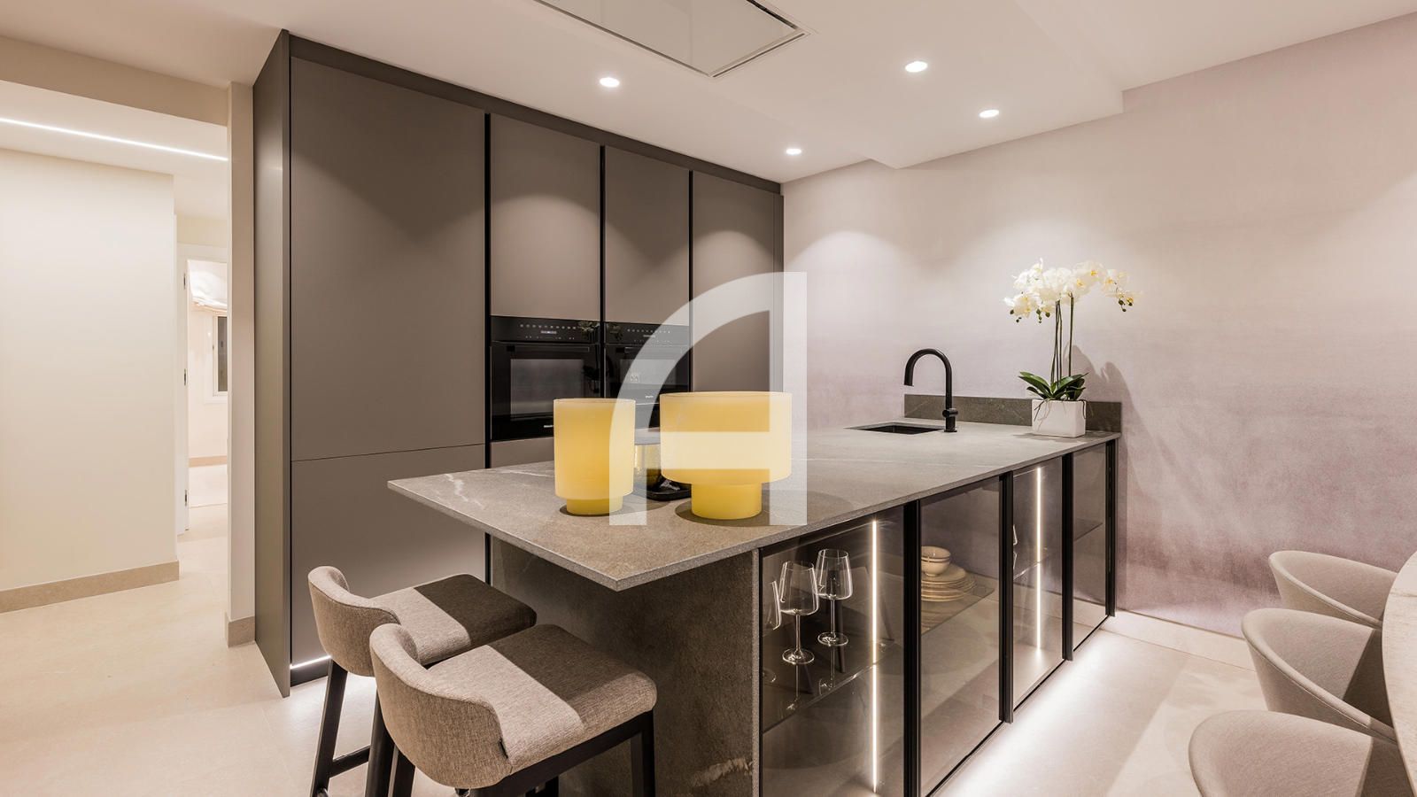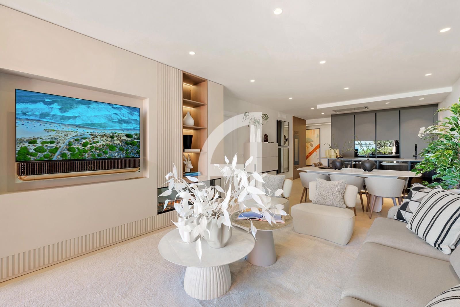 La superficie construida de 130 m² alberga un salón-comedor de diseño abierto, perfectamente conectado con una cocina gourmet equipada con electrodomésticos de alta gama, vinoteca y placa moderna. El piso cuenta con tres dormitorios amplios y dos baños elegantes, pensados para ofrecer confort y funcionalidad. El dormitorio principal dispone de acceso directo a una terraza privada de generosas dimensiones (≈ 42 m²), un espacio ideal para relajarse, disfrutar del clima mediterráneo o contemplar el mar.