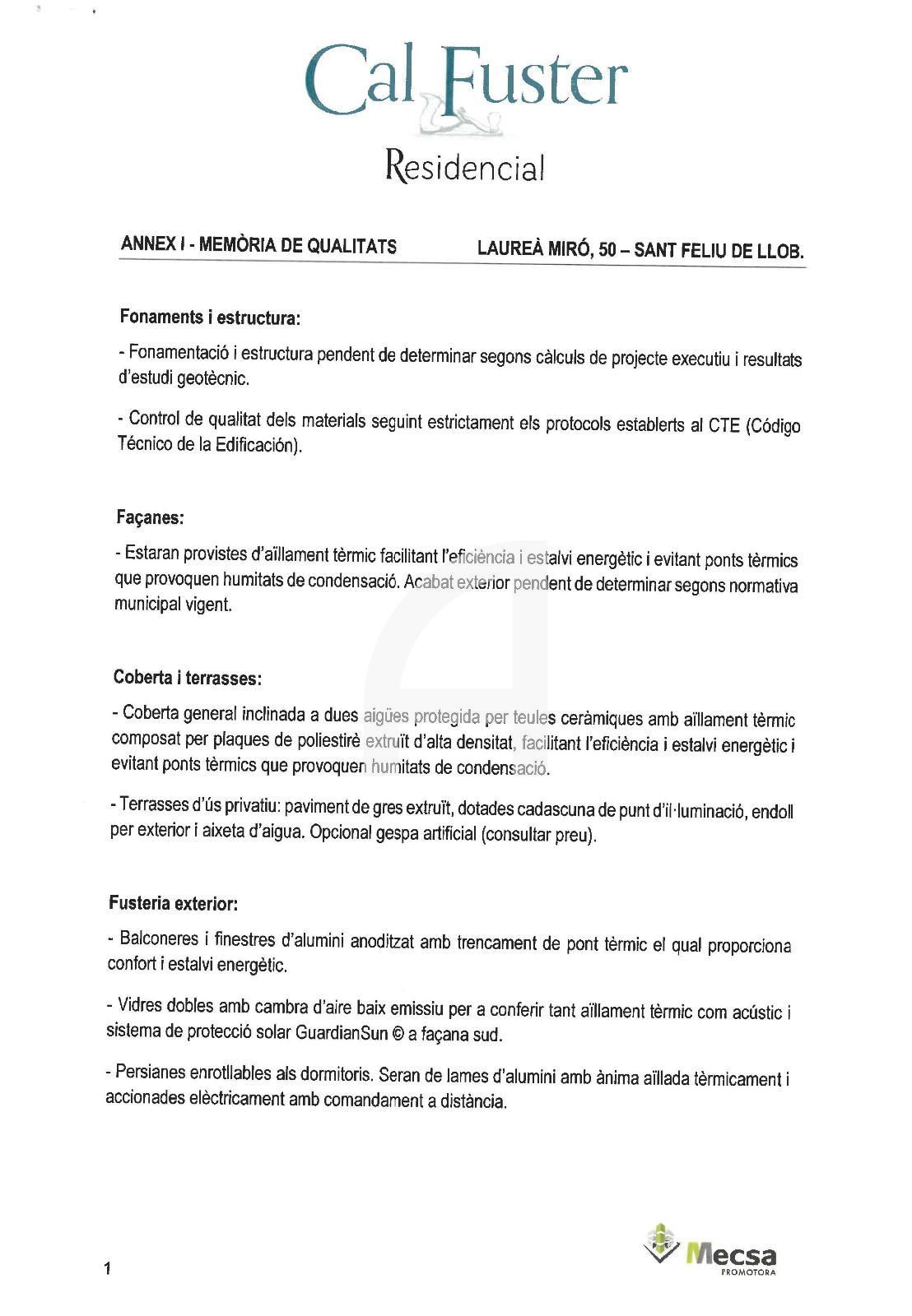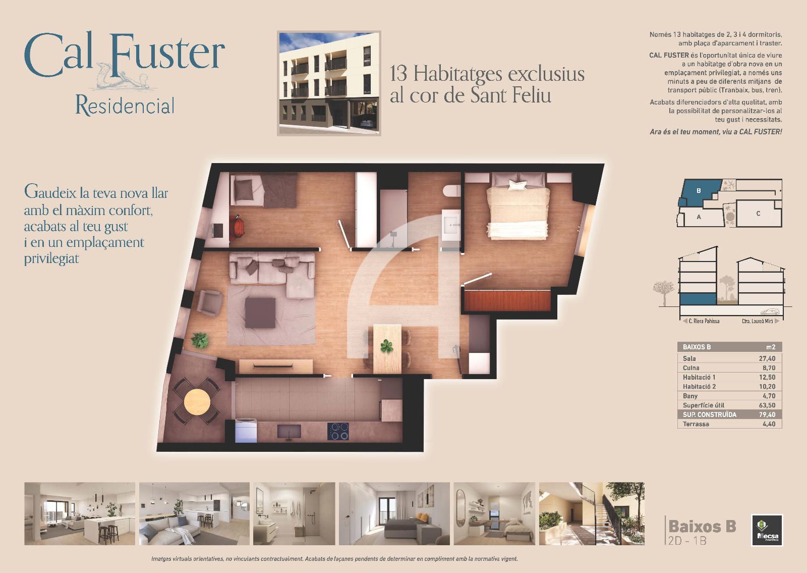 Habitatge de 79.40 m² construïts i 63.50 útils, situat a la nova promoció d´obra nova Cal Fuster Residencial. Es distribueix en dues habitacions, un bany i una terrassa de 4,40 m², amb calefacció per conductes i terres radiants i aire condicionat ja instal·lat per a confort tot l'any. L'orientació i la distribució optimitzen l'entrada de llum natural i generen un ambient agradable i funcional per al dia a dia.