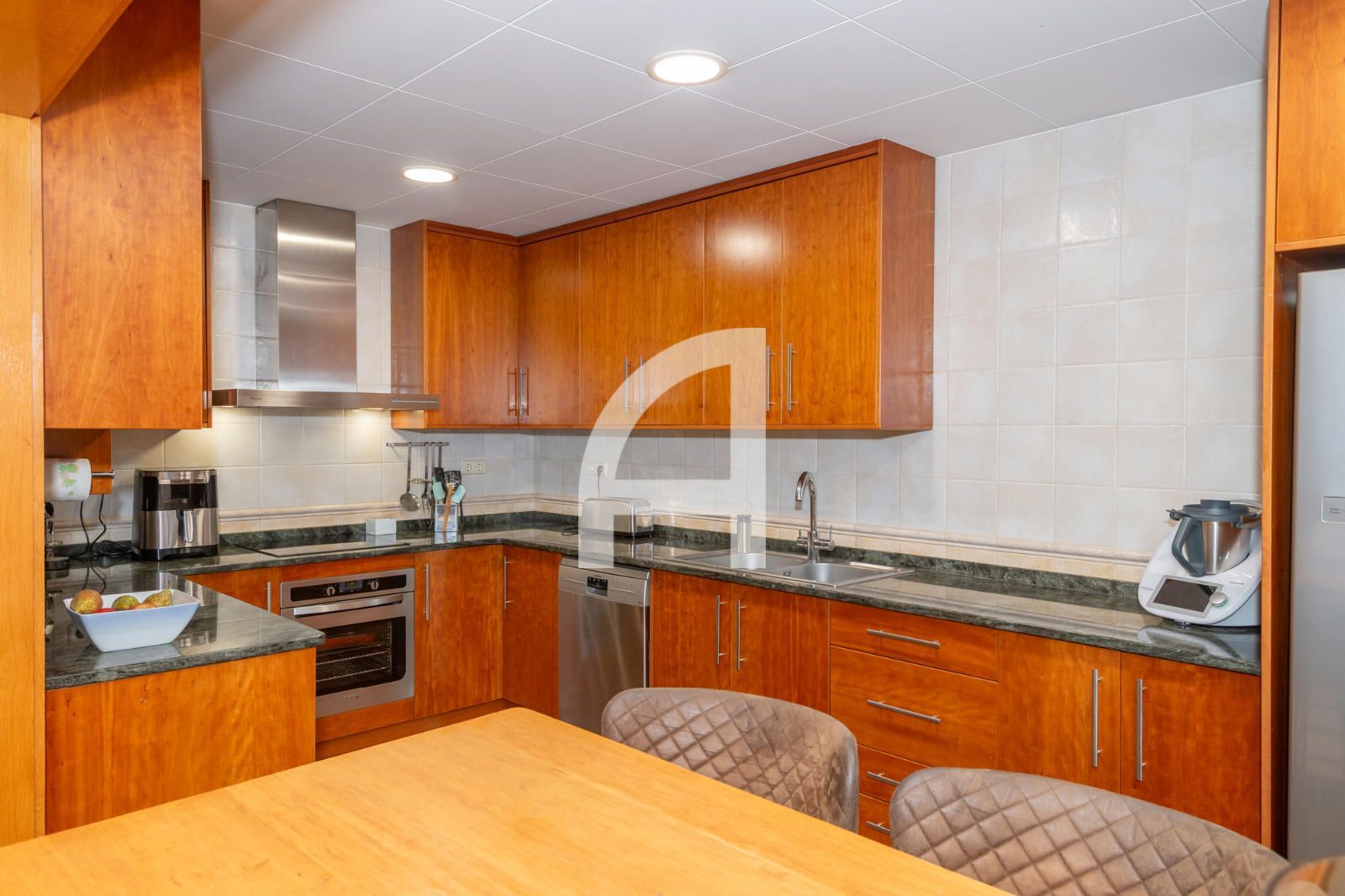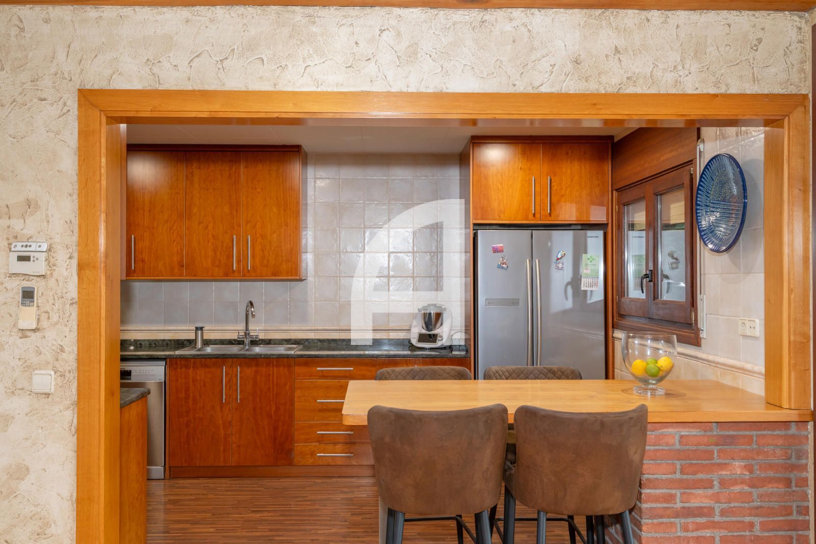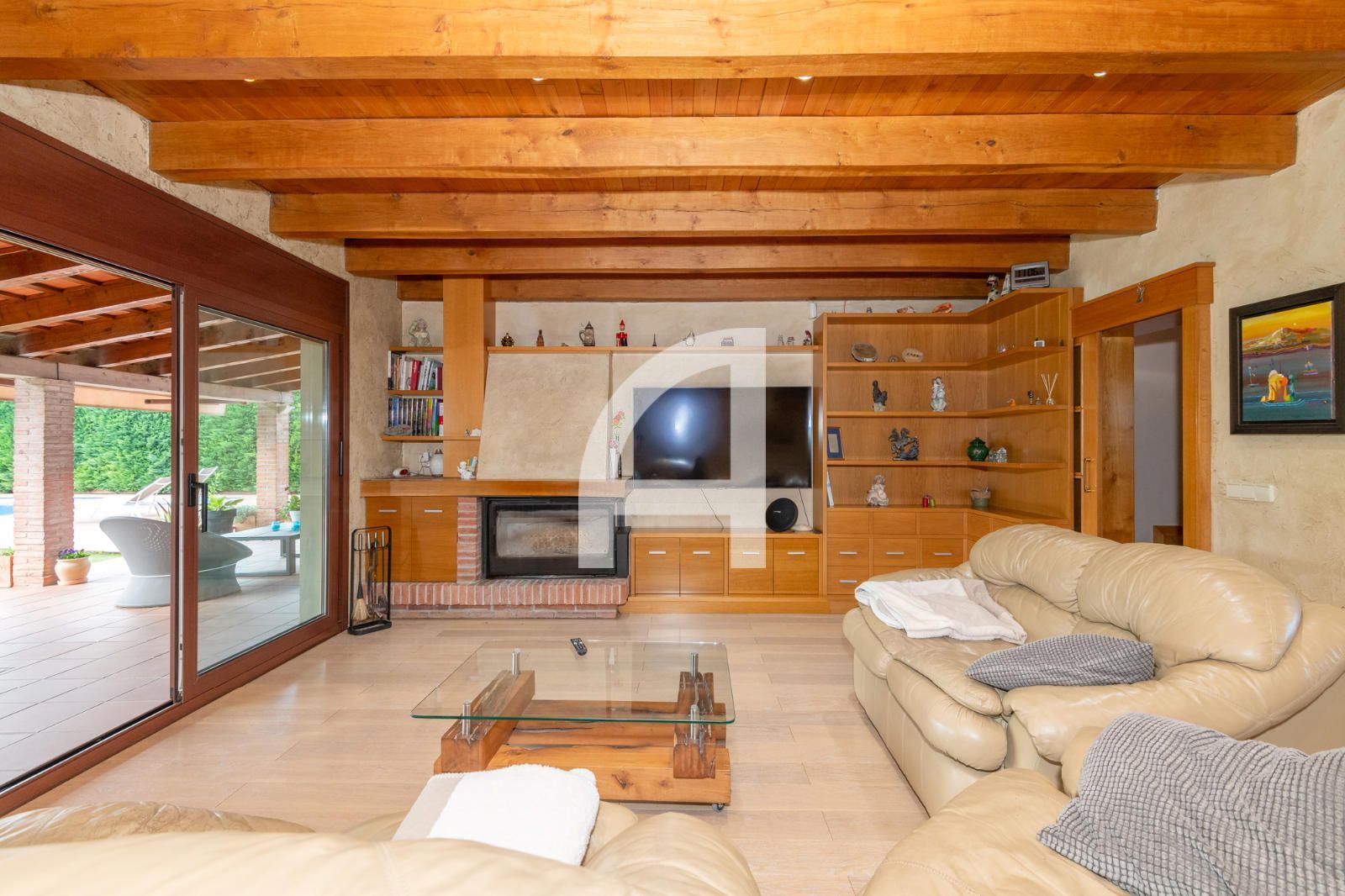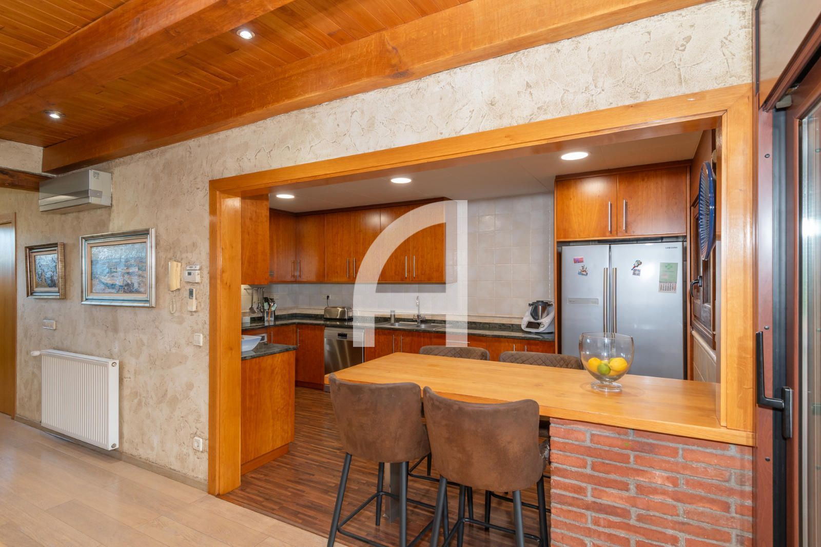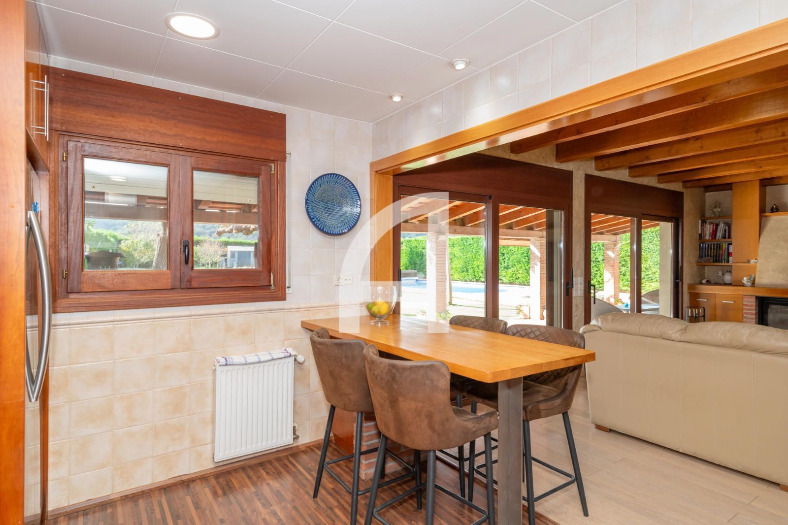 La cuina moblada, oberta a la zona del menjador i a la sala d'estar amb llar de foc, amb sortida al porxo i piscina.