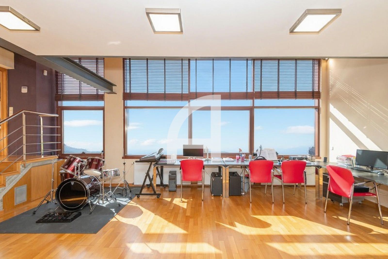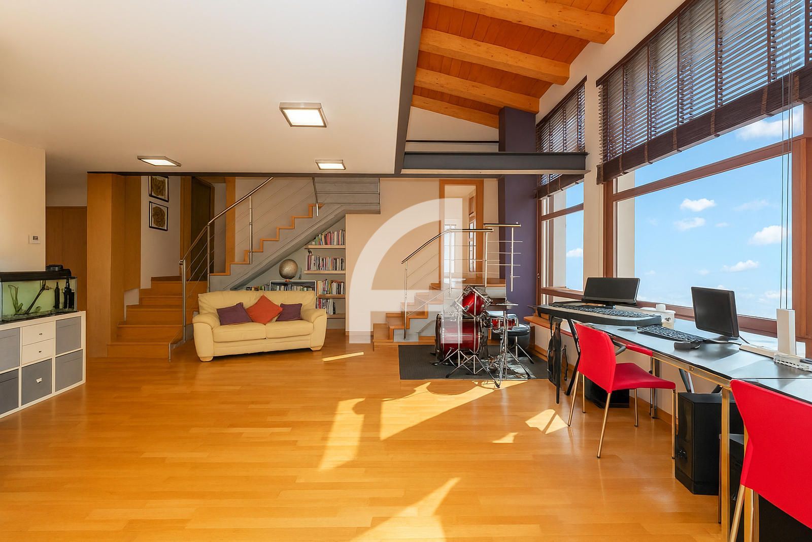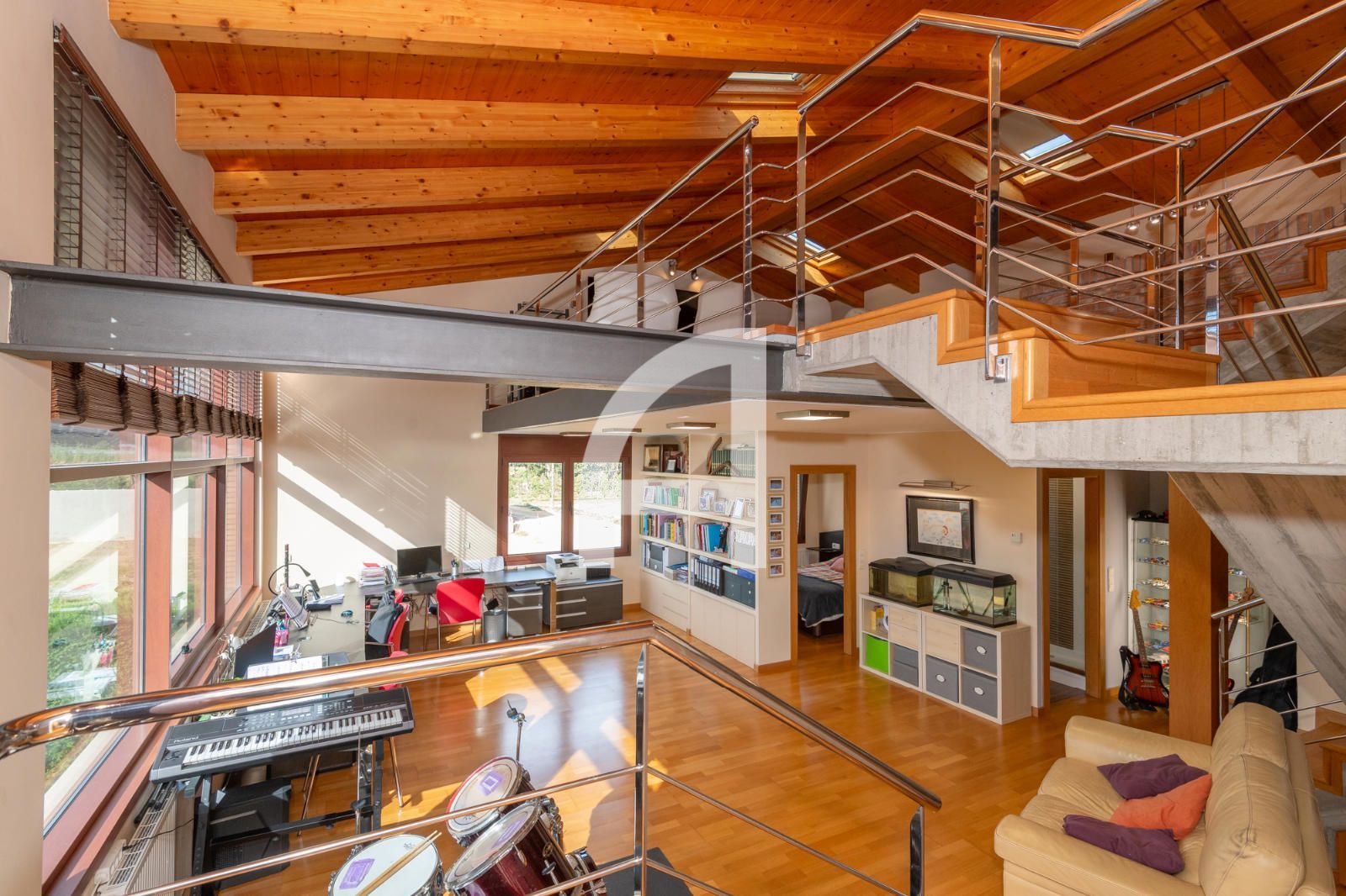 A la planta superior apareix un loft obert, per una escala modern i passarel·les de metall que aporten una sensació d'amplitud, amb uns finestrals on es pot gaudir de les espectaculars vistes, actualment convertit en estudi de música.