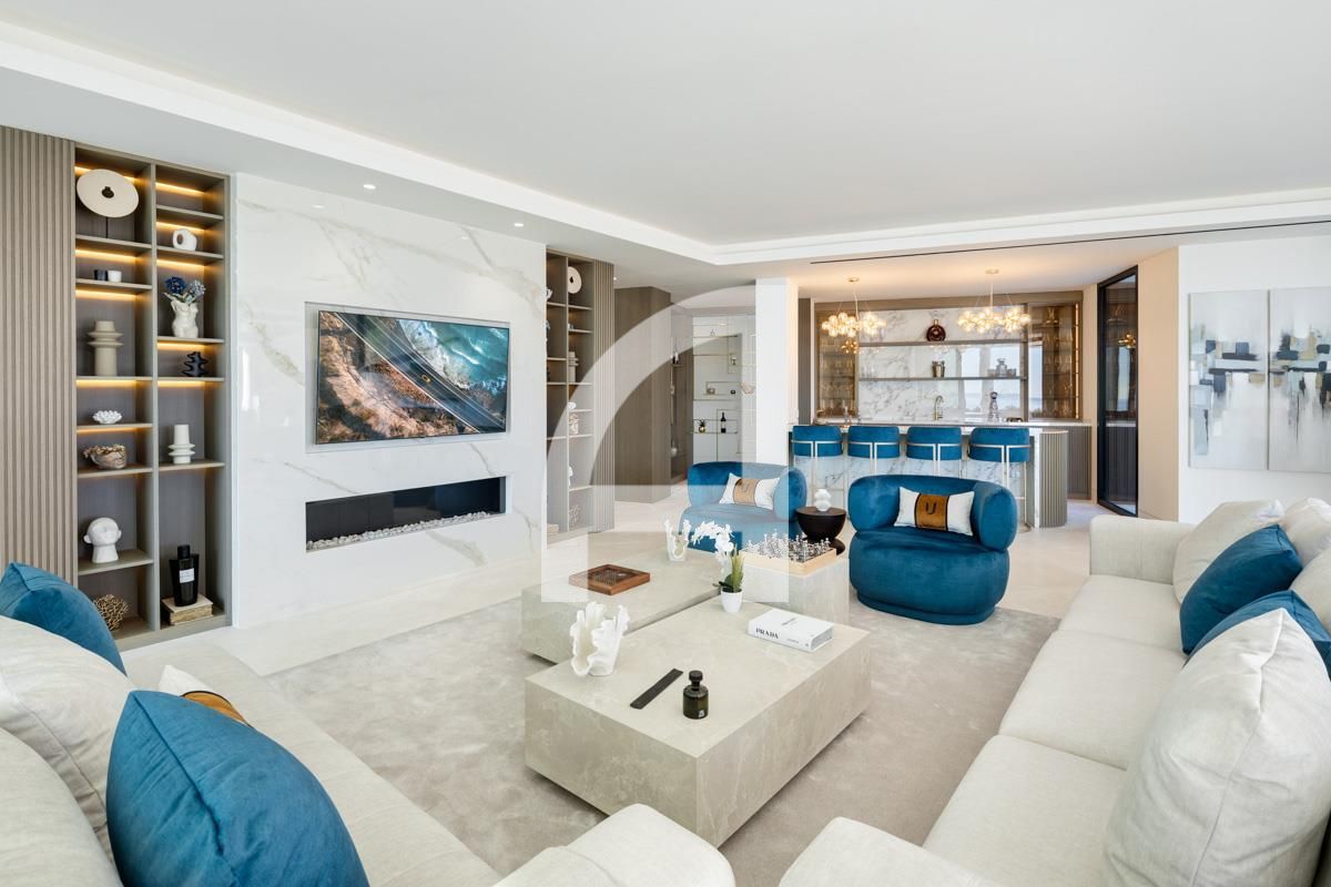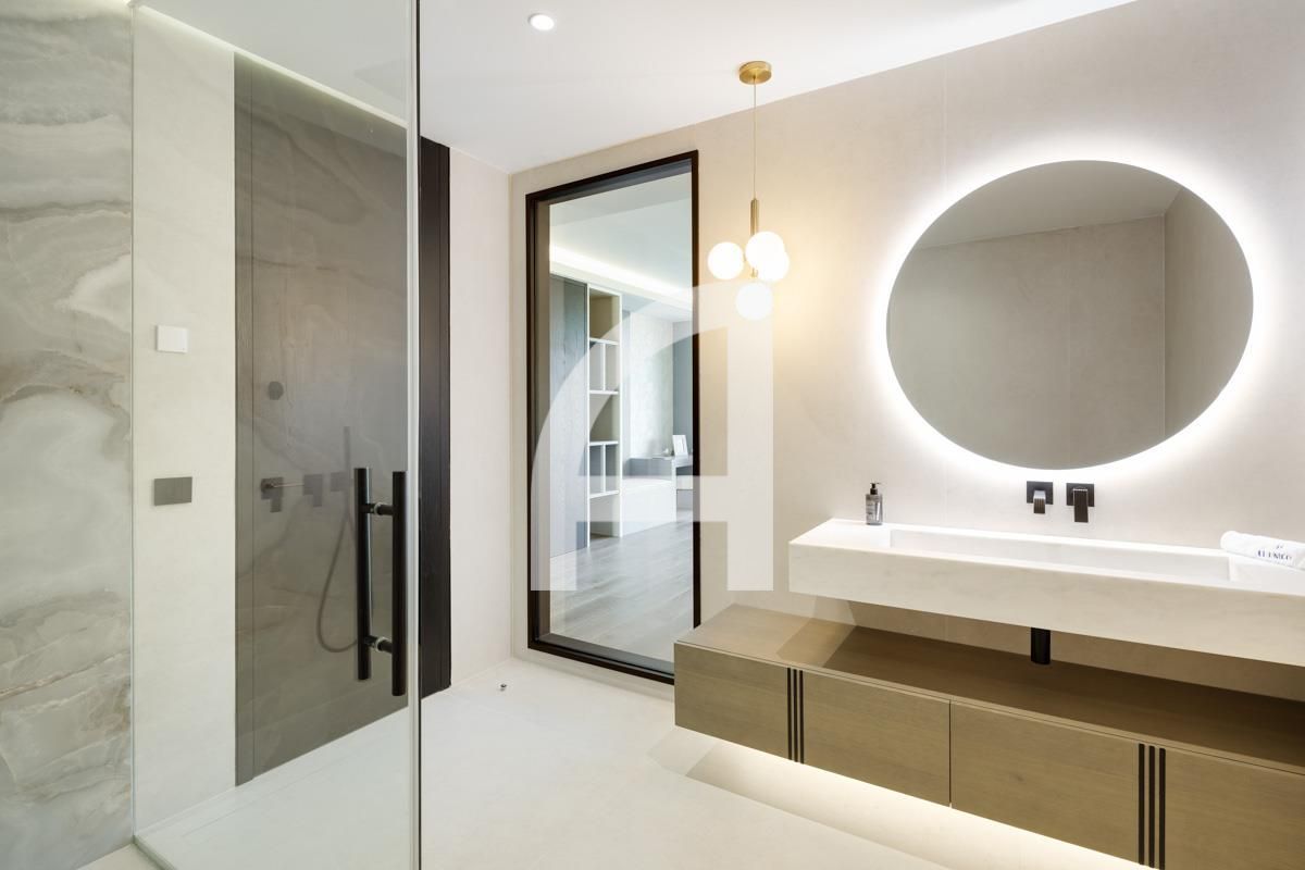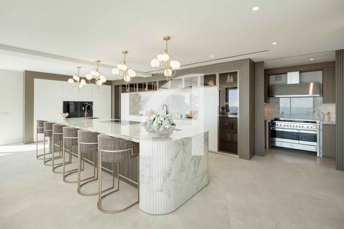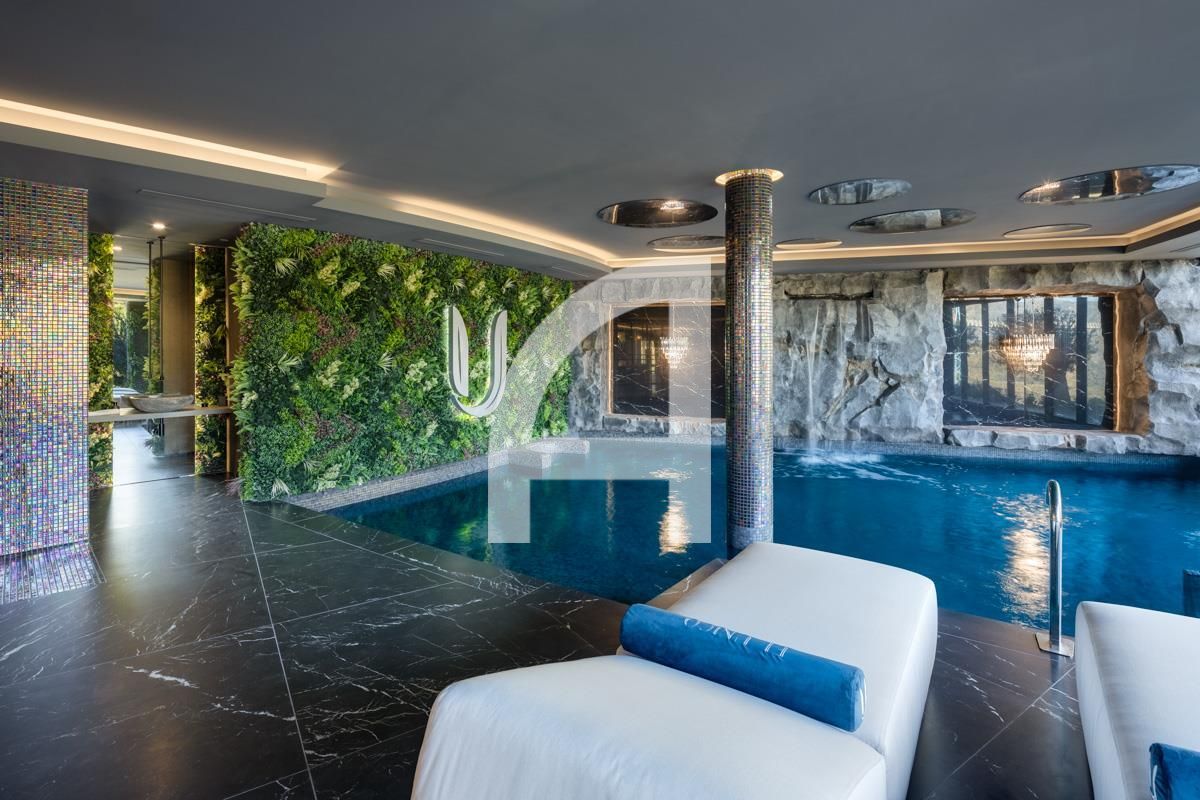 This magnificent residence features a state-of-the-art gourmet kitchen complemented by stunning external water features, soaring double-height ceilings, and a master bathroom uniquely designed by a renowned fashion designer. Indulge in leisure with a dedicated games area complete with a bowling alley, an expansive rooftop terrace perfect for entertaining, and uninterrupted sea vistas. The outdoor amenities include access to a luxurious beach club and inviting indoor/outdoor pool areas, all contributing to a lifestyle of elegance.