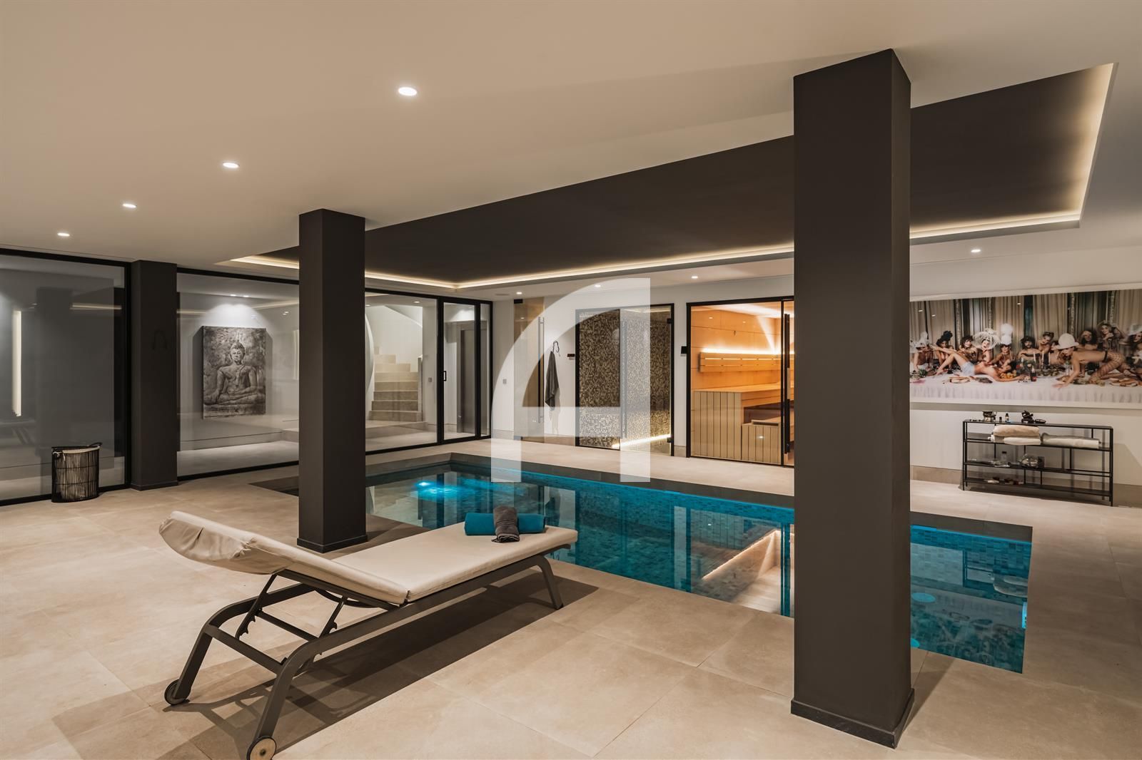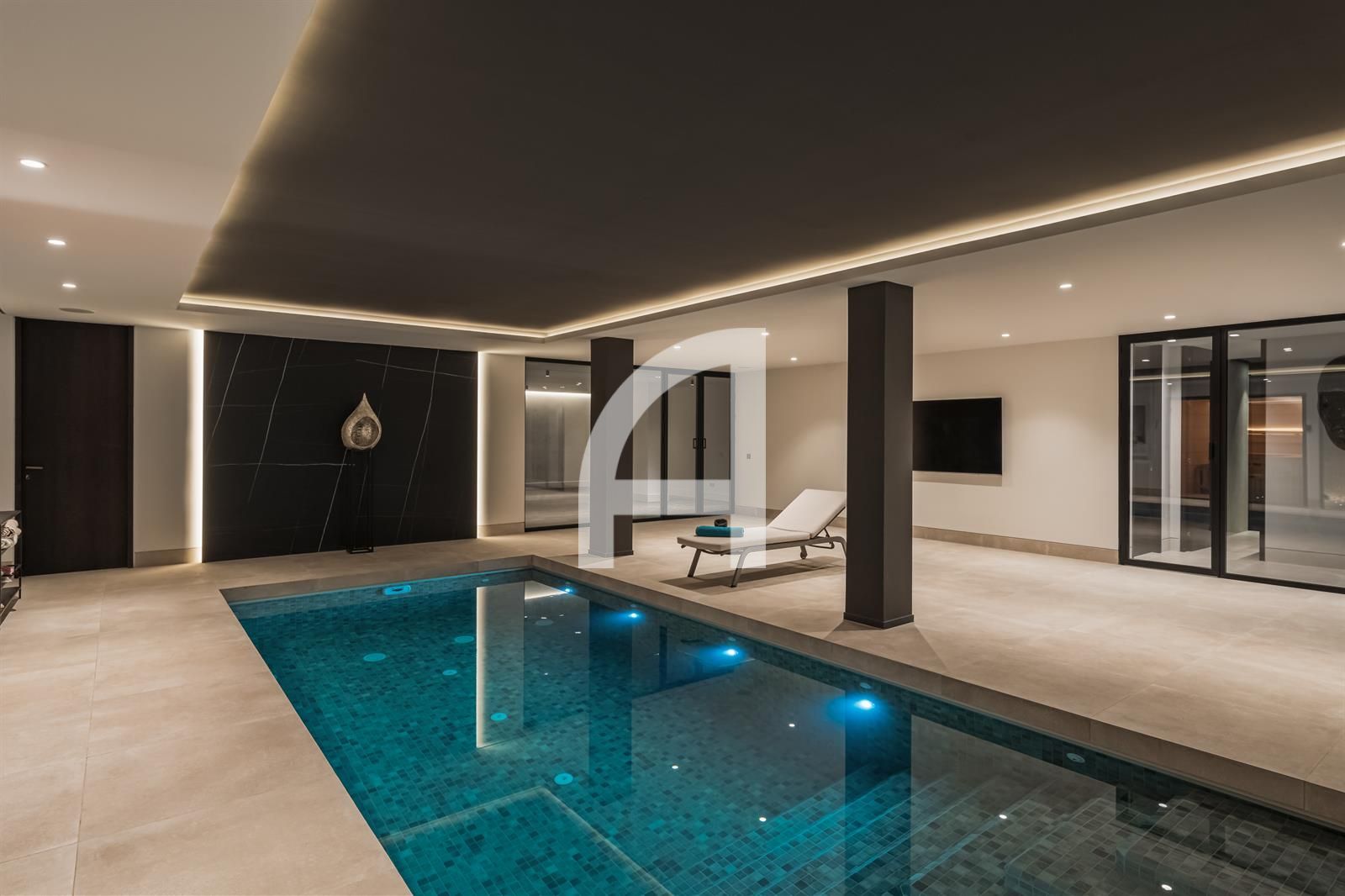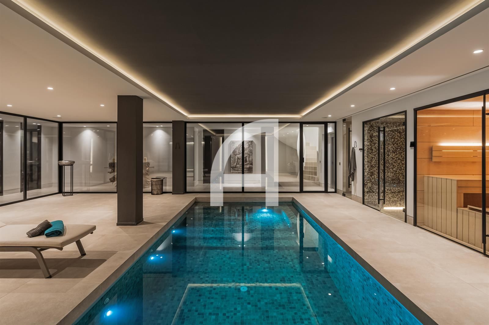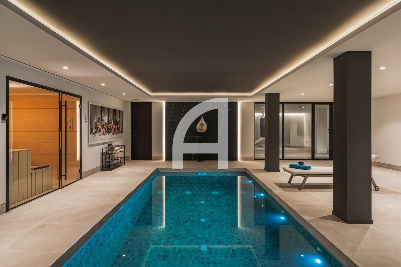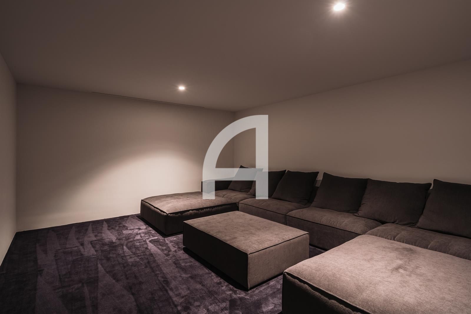 Inside, you will find luminous open-plan living areas, a fully equipped chef's kitchen, tranquil bedrooms, and stylish bathrooms. Exceptional highlights of this home include a Dolby surround sound system, a cozy fireplace, and expansive glass doors that seamlessly connect indoor and outdoor living spaces. The villa also encompasses a basement, sauna, indoor pool, gym, solarium, and a home theater, with additional room for a guest suite or personalized enhancements.