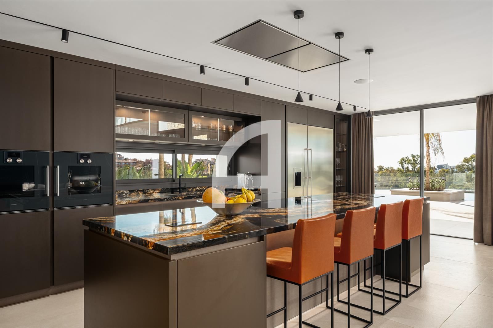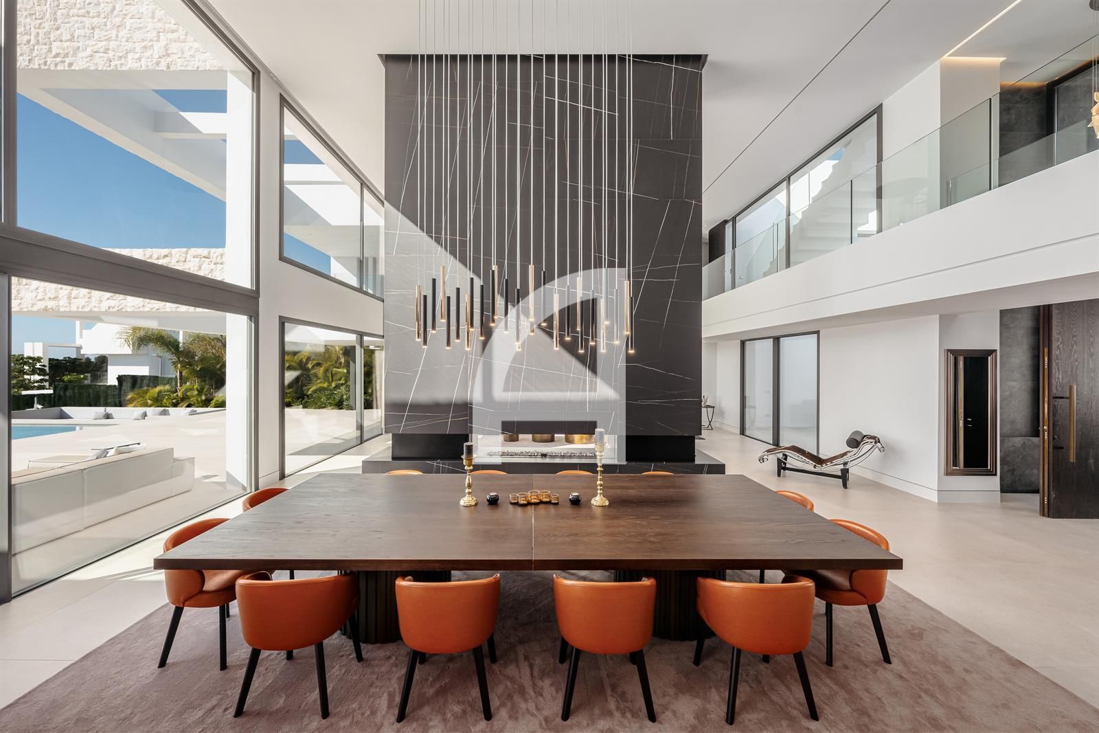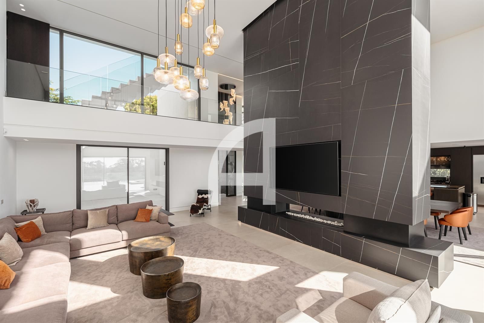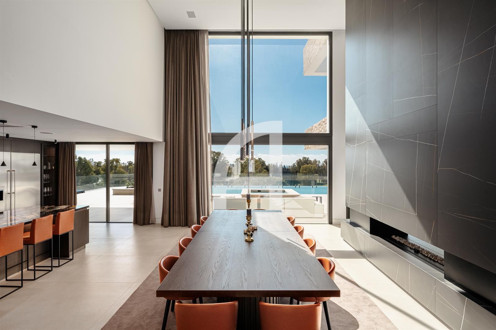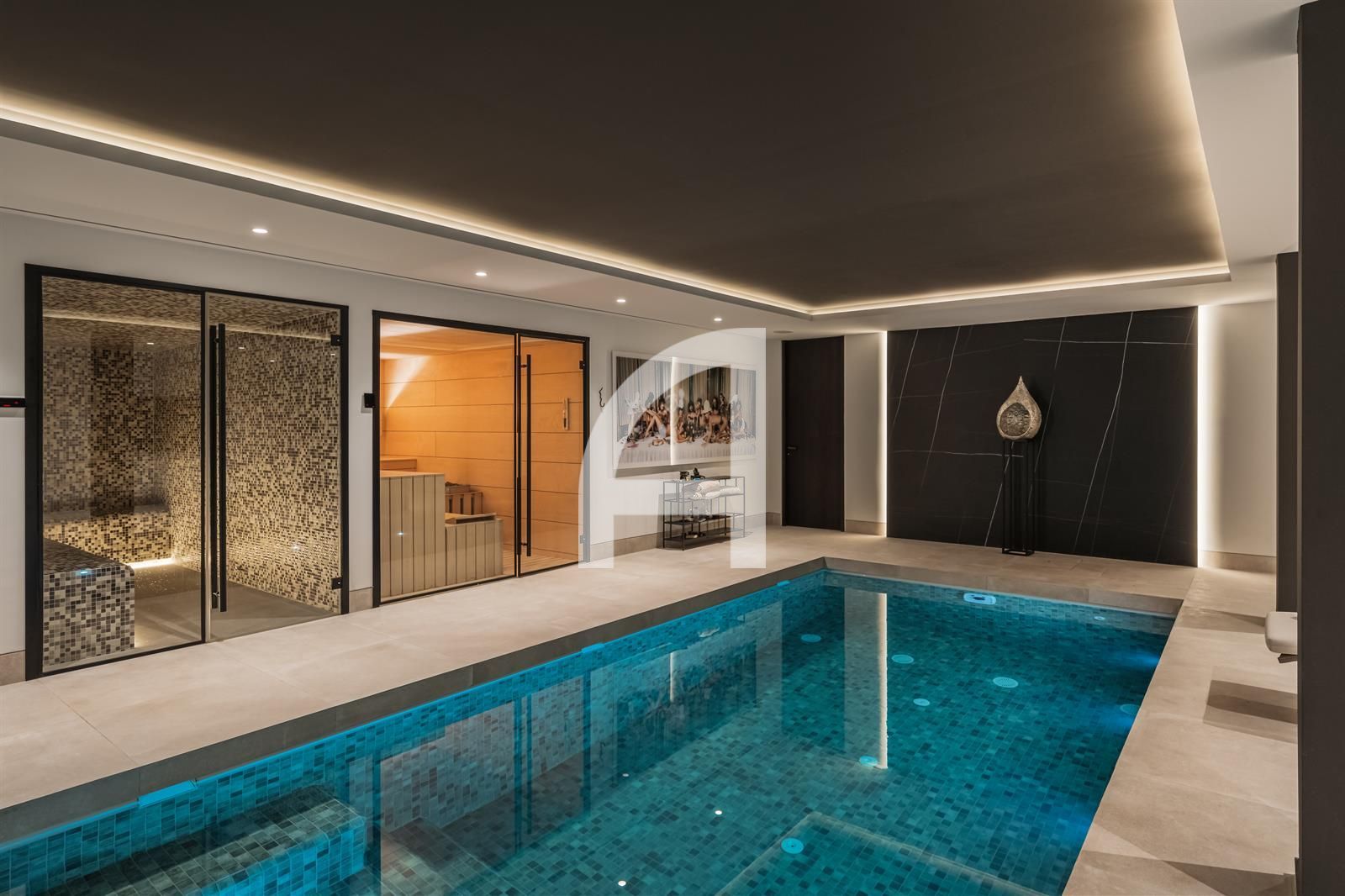 Inside, you will find luminous open-plan living areas, a fully equipped chef's kitchen, tranquil bedrooms, and stylish bathrooms. Exceptional highlights of this home include a Dolby surround sound system, a cozy fireplace, and expansive glass doors that seamlessly connect indoor and outdoor living spaces. The villa also encompasses a basement, sauna, indoor pool, gym, solarium, and a home theater, with additional room for a guest suite or personalized enhancements.