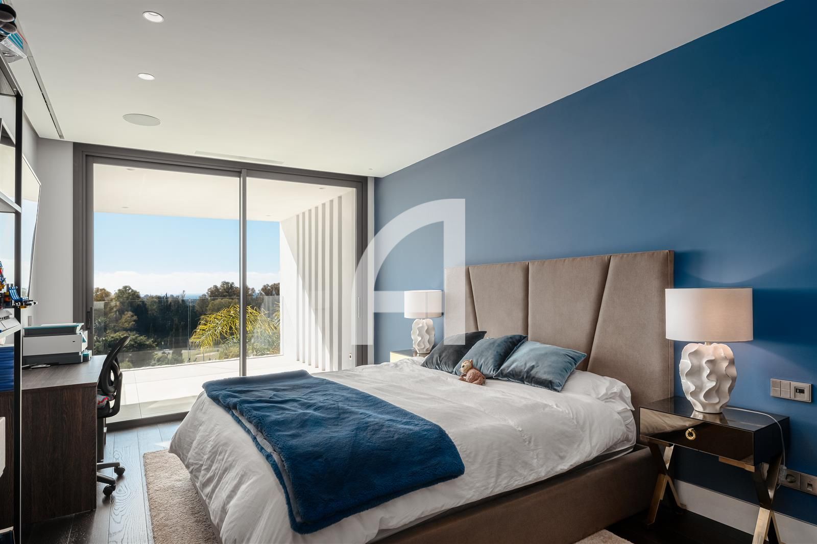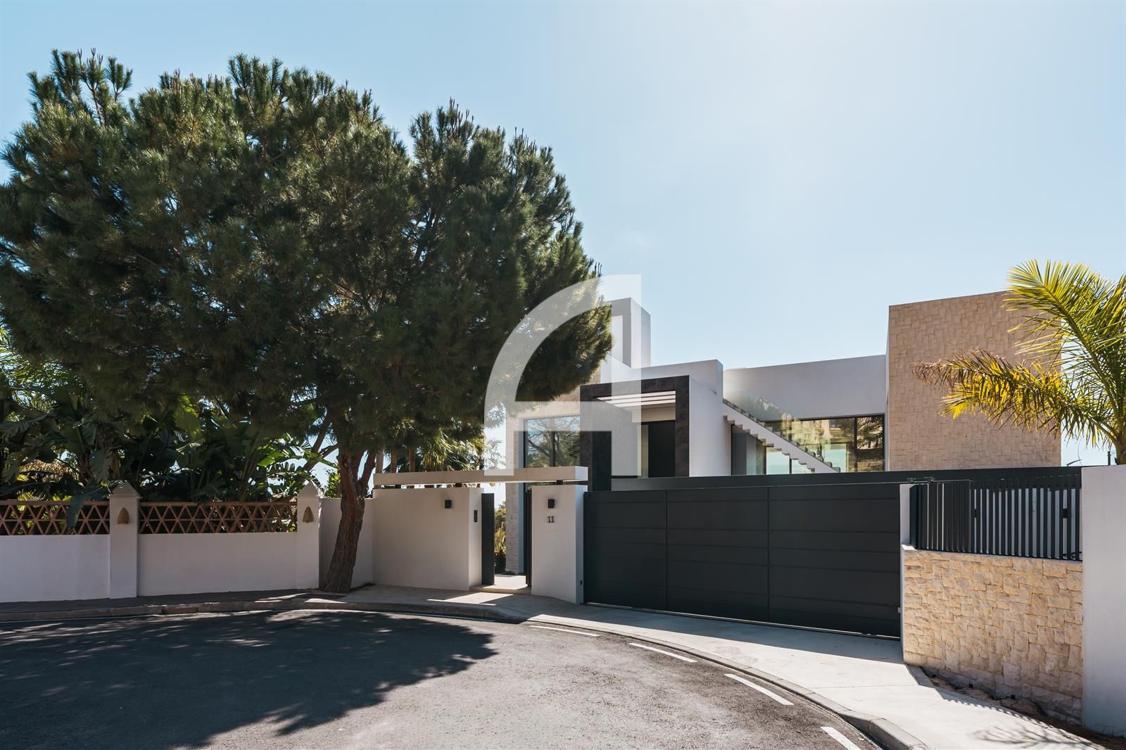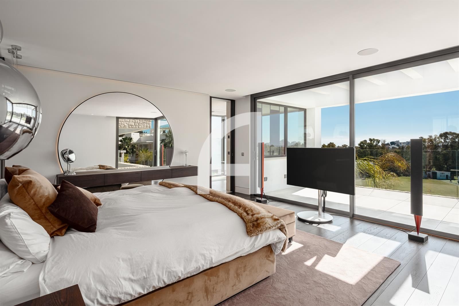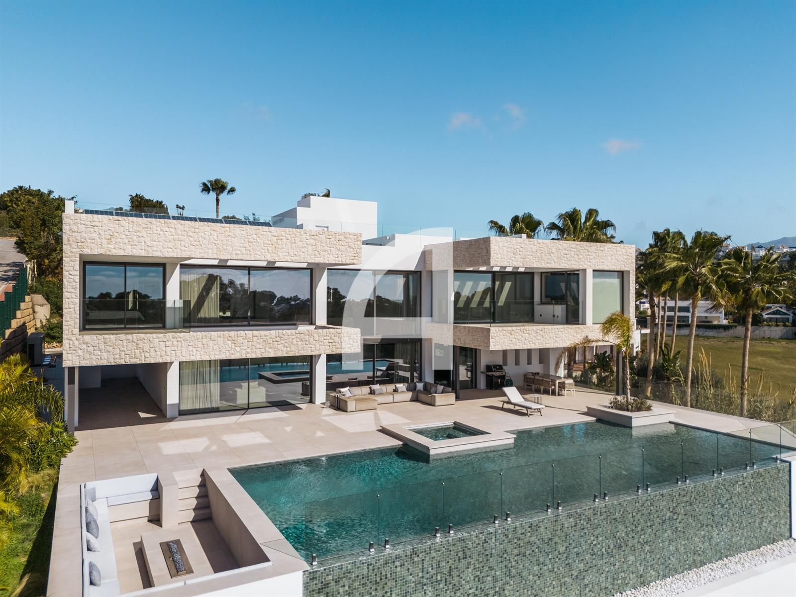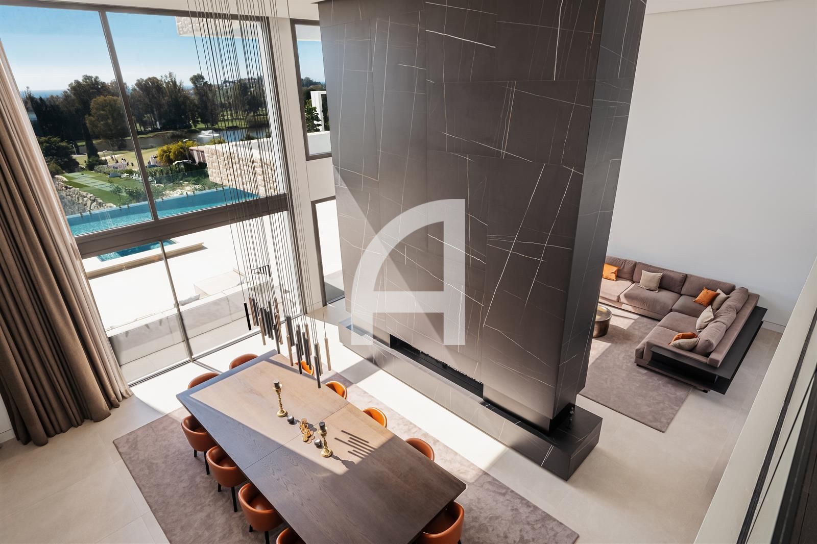 Set on an expansive plot, the villa's architecture harmoniously integrates with its picturesque surroundings, showcasing a modern elegance that resonates throughout the property. Meticulously designed for year-round comfort, it features advanced amenities including air conditioning, solar panels, underfloor heating, and a sophisticated home automation system.