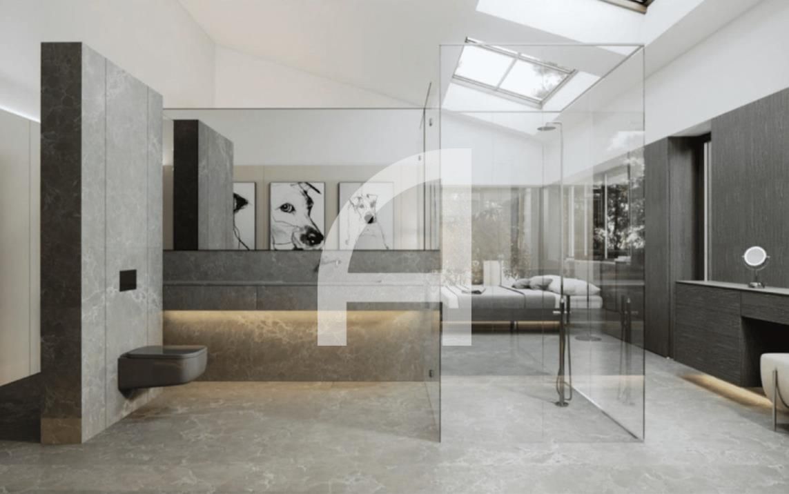 The first floor is designed for both relaxation and entertainment, boasting a contemporary guest toilet, a fully equipped kitchen furnished with high-end appliances, and an expansive living-dining area that opens up to the master suite complete with an en-suite bathroom and dressing room. The heated swimming pool invites year-round enjoyment, adding a touch of opulence to daily living.