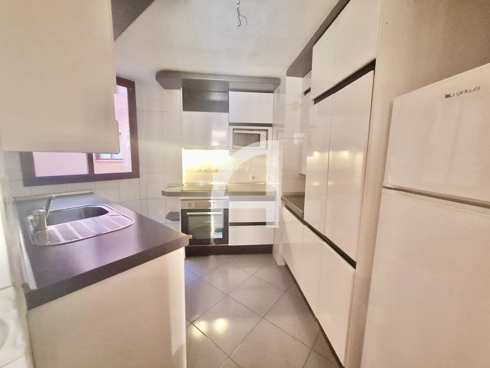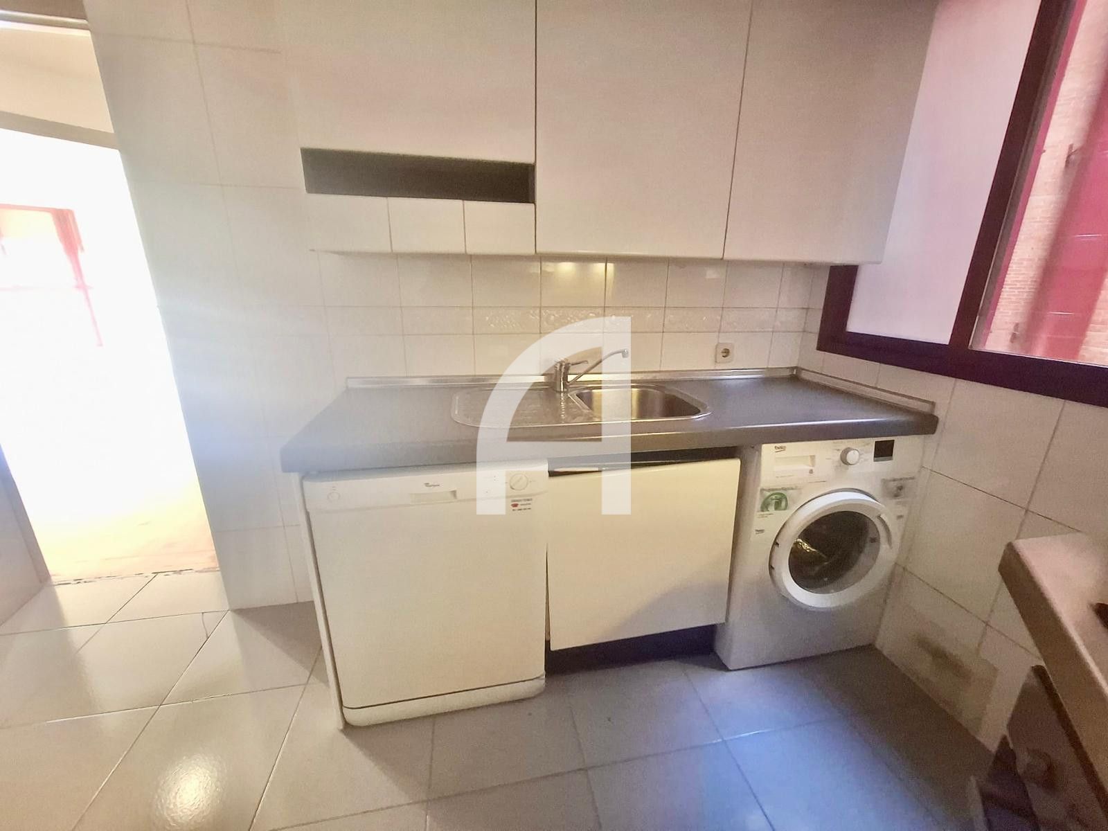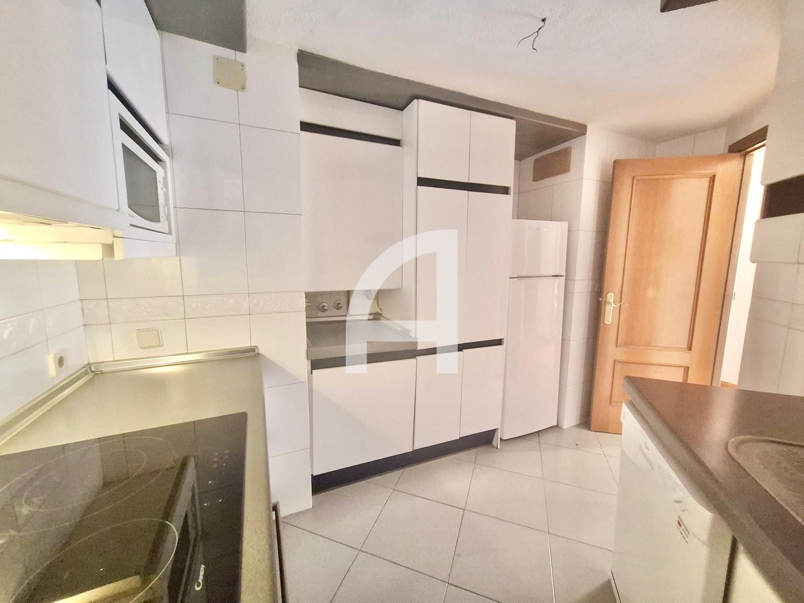 A la derecha está la cocina, totalmente equipada de muebles altos y bajos en color blanco y todos los electrodomésticos (lavadora, lavavajillas, microondas, vitrocerámica, horno, campana extractora y frigorífico).