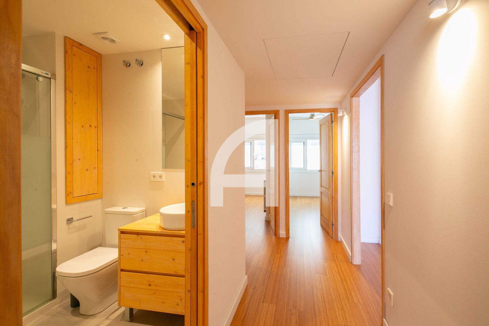 El parqué ecológico de caña de bambú añade calidez y durabilidad, manteniendo un compromiso medioambiental sin renunciar al estilo. El sistema de aire acondicionado incorpora filtro antivirus para un ambiente más limpio en todas las estancias. El diseño interior se ha concebido para movilidad reducida, con accesos y repartos que facilitan la vida diaria y la autonomía.