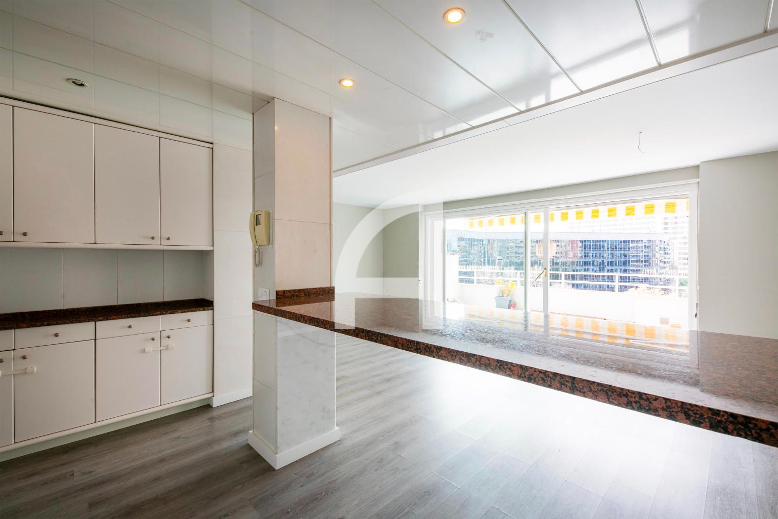 Piso ejecutivo de 150 m² en sexta planta, toda la vivienda exterior y muy luminosa, situada en una finca joven con buena presencia y portería cuidada, servicio de conserje diurno y vistas verdes despejadas. El inmueble ofrece un salón comedor amplio con cocina americana y una espléndida terraza muy habitable, ideal para momentos de ocio o reuniones al aire libre con vistas abiertas. La distribución aprovecha al máximo la luz natural, con todas las estancias orientadas a exterior.