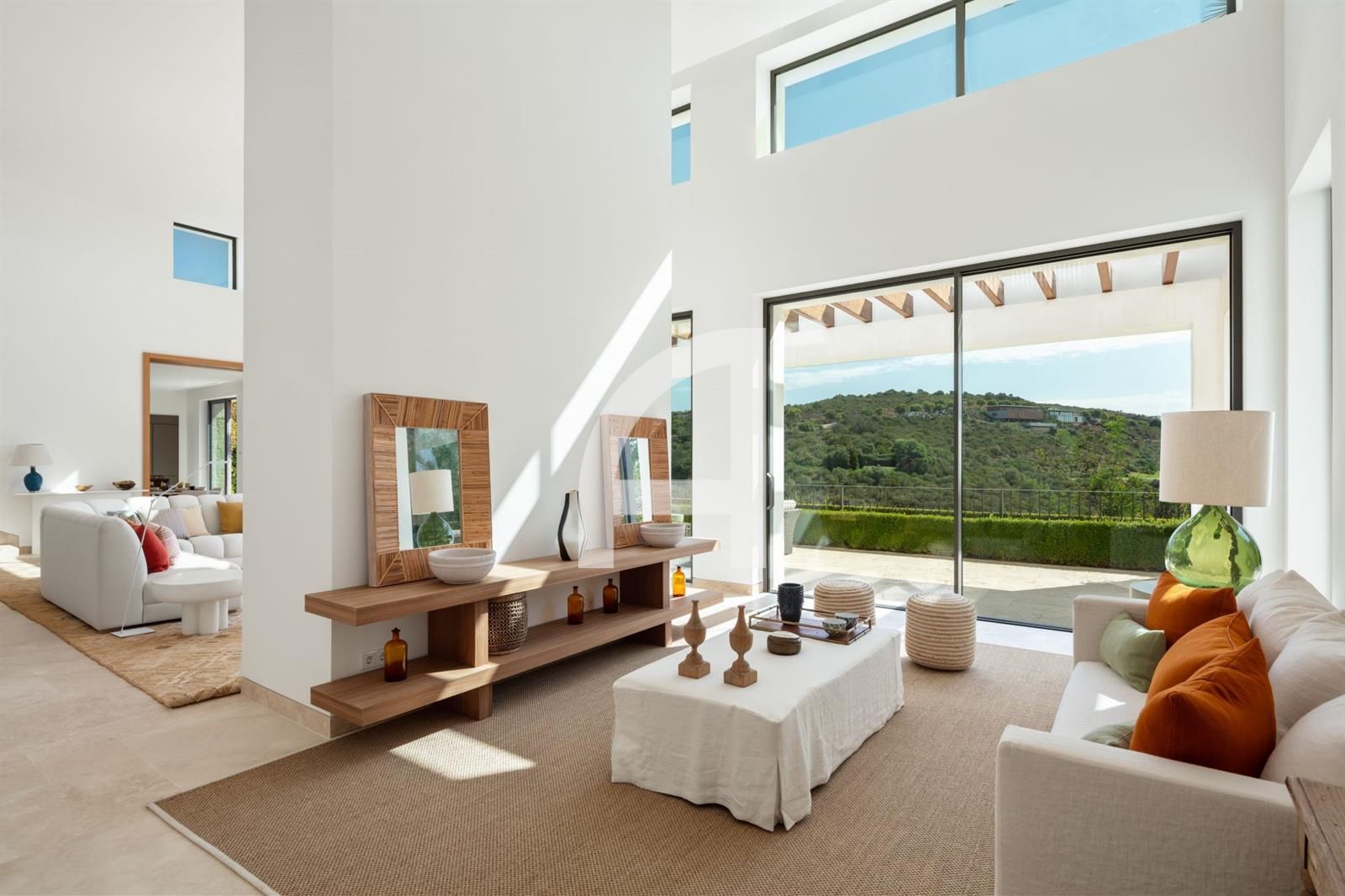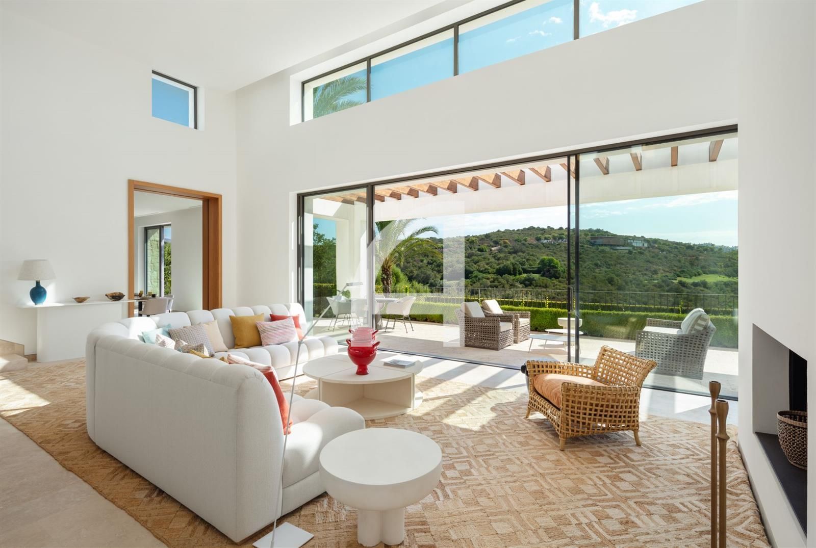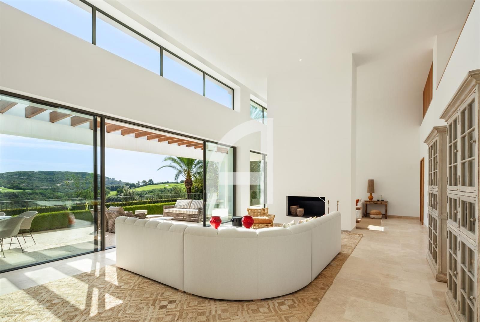 La planta baja integra sin fisuras la vida interior y exterior, con acceso directo a una terraza que permite disfrutar de la belleza del paisaje circundante. En el nivel del jardín, se encuentran amplias terrazas que invitan a disfrutar de comidas al aire libre y momentos de relajación, rodeadas de un jardín meticulosamente cuidado, una piscina privada y vistas impresionantes del campo de golf. Aunque dos dormitorios para invitados con acceso al jardín se encuentran convenientemente en la planta baja, las habitaciones restantes están ubicadas en la planta superior.