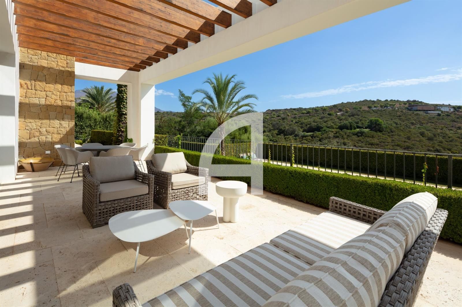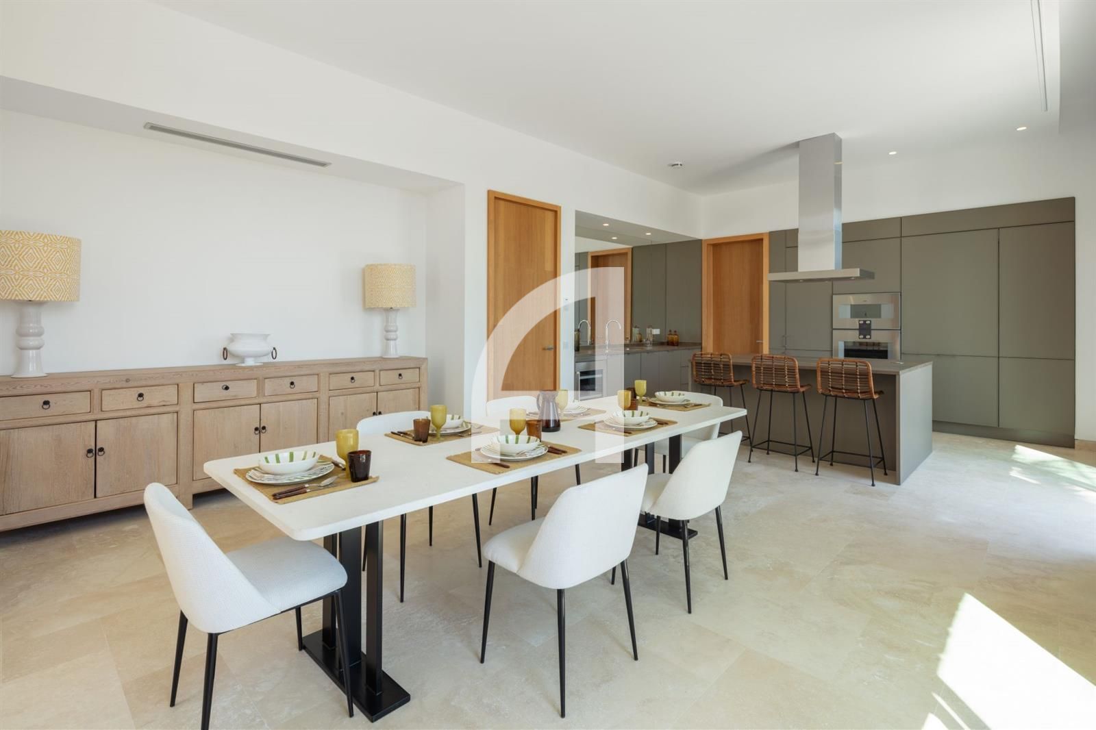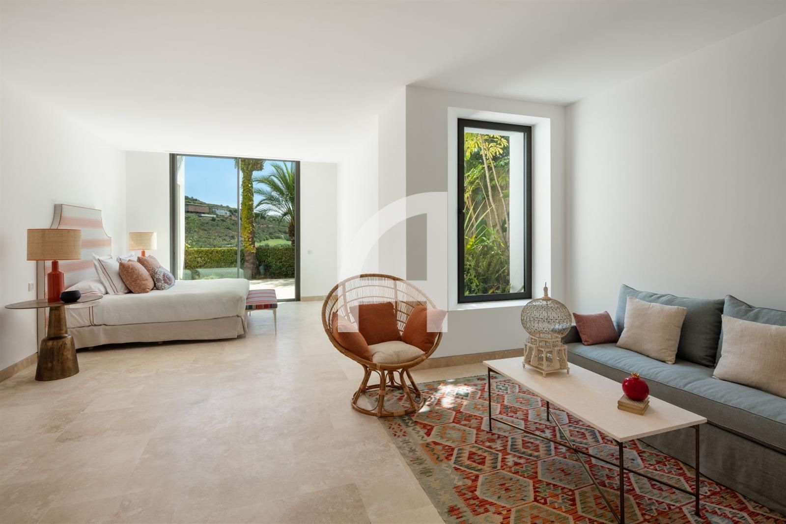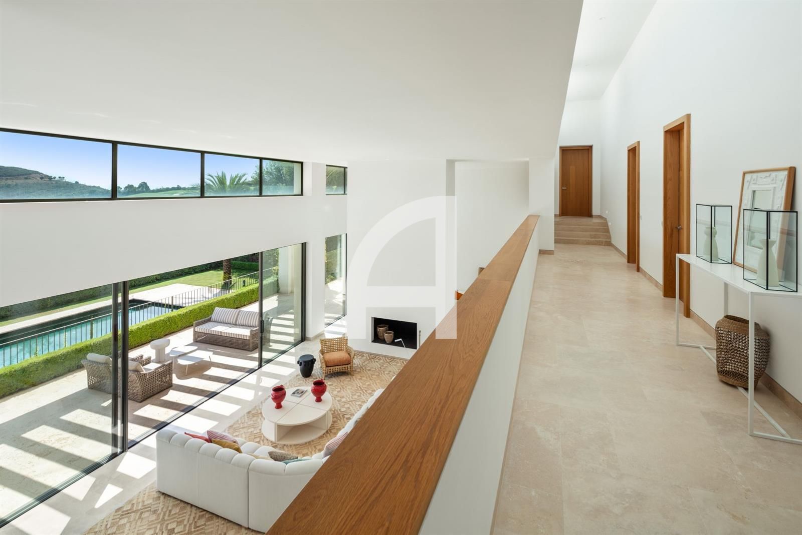 La planta baja integra sin fisuras la vida interior y exterior, con acceso directo a una terraza que permite disfrutar de la belleza del paisaje circundante. En el nivel del jardín, se encuentran amplias terrazas que invitan a disfrutar de comidas al aire libre y momentos de relajación, rodeadas de un jardín meticulosamente cuidado, una piscina privada y vistas impresionantes del campo de golf. Aunque dos dormitorios para invitados con acceso al jardín se encuentran convenientemente en la planta baja, las habitaciones restantes están ubicadas en la planta superior.