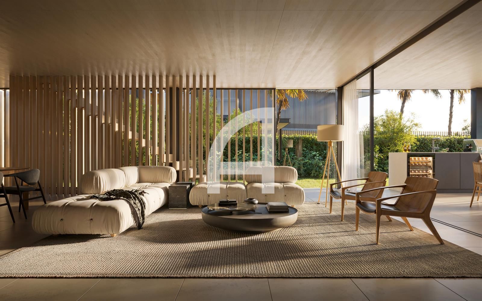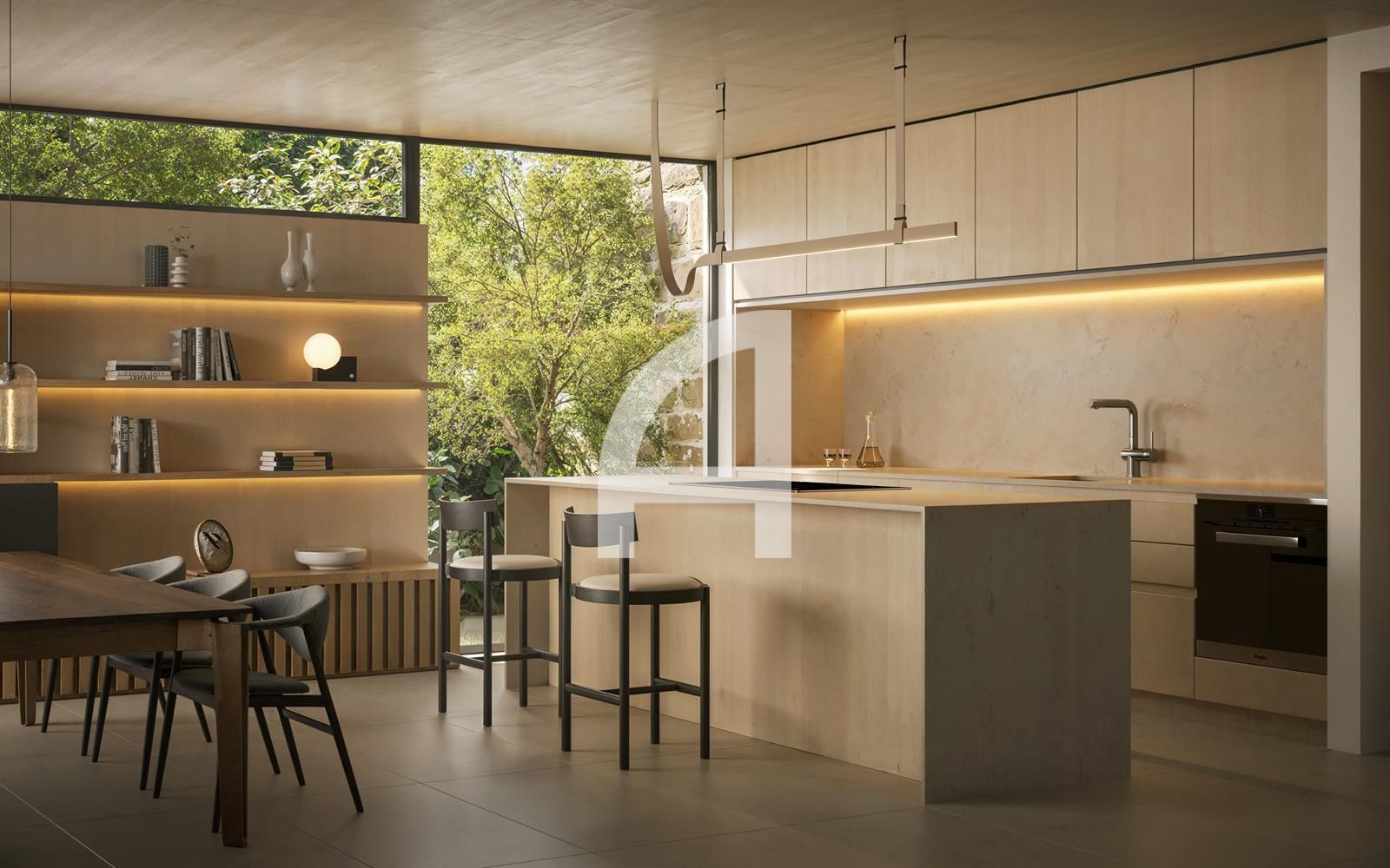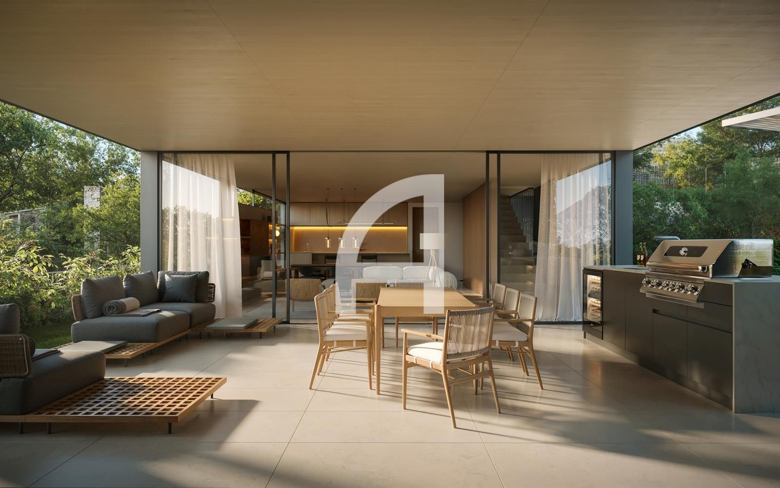 Los interiores han sido elaborados con precisión, combinando una estética sofisticada con un diseño funcional. El concepto de espacio abierto conecta la cocina, la sala de estar y el comedor, todos realzados por puertas de vidrio de piso a techo que inundan el ambiente de luz natural y ofrecen acceso directo a las áreas exteriores.
